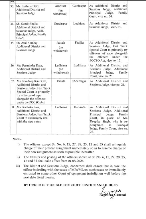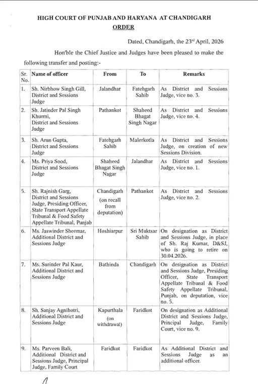 पंजाब। पंजाब एवं हरियाणा हाई कोर्ट ने आज एक आदेश जारी कर 84 जजों का तबादला कर दिया है। इनमें 38 जज पंजाब के हैं, जबकि 46 जज हरियाणा के हैं। इसमें निर्भय सिंह गिल को जालंधर से फतेहगढ़ साहिब, जितेंद्र पाल सिंह को पठानकोट से एसबीएस नगर, अरुण गुप्ता को फतेहगढ़ साहिब से मलेरकोटला भेजा गया है। वहीं मोहाली के हरदीप सिंह, एडिशनल डिस्ट्रिक्ट एवं सेशन जज को एग्जीक्यूटिव स्पेशल कोर्ट में ट्रायल के लिए NIA केस भी सौंपे गए हैं। इस आधिकारिक आदेश के माध्यम से कई अतिरिक्त जिला एवं सत्र न्यायाधीशों (Additional District and Sessions Judges) के तबादले और नई नियुक्तियाँ की गई हैं। इस सूची के अनुसार, सुश्री हरिंदर सिद्धू को पटियाला से चंडीगढ़ स्थानांतरित किया गया है, जबकि श्री तरनतारन सिंह बिंद्रा को फाजिल्का से रूपनगर भेजा गया है। आदेश की एक मुख्य विशेषता नए न्यायालयों की स्थापना है, जिसके तहत श्री हरीश आनंद, श्री जसविंदर सिंह-I, सुश्री रश्मि कपिला और डॉ. मनदीप मित्तल को उनके संबंधित जिलों में नवनिर्मित स्पेशल एनआरआई कोर्ट (Special NRI Court) में तैनात किया गया है। इसके अतिरिक्त, श्री हरदीप सिंह को एस.ए.एस. नगर (मोहाली) में एनआईए एक्ट (NIA Act) के मामलों की सुनवाई के लिए विशेष अदालत का प्रभार दिया गया है। अधिकांश नियुक्तियाँ प्रशासनिक आवश्यकताओं और रिक्त पदों को भरने के उद्देश्य से की गई हैं।