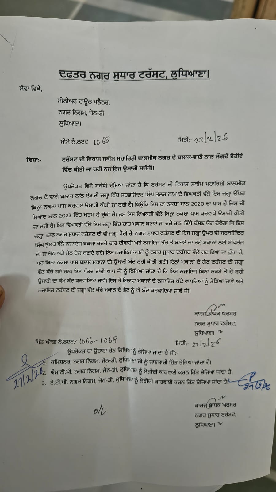 लुधियाना इंप्रूवमेंट ट्रस्ट की ओर से नगर निगम को चिट्ठी लिख इस बात का खुलासा किया है। ट्रस्ट ने इस पत्र के जरिए नगर निगम को इस इलीगल निर्माण को रुकवाने की हिदायत की गई है । आपको बता दे कि इंप्रूवमेंट ट्रस्ट की ओर से जहां सरकारी जमीन पर कब्जा करने को चारदीवारी की गई थी, उसे गिरा डाला गया। इसके बाद ट्रस्ट की ओर से उनकी जमीन पर डाले गए अवैध सीवरेज सिस्टम को भी तो डाला गया। साथ-साथ ट्रस्ट की ओर से नगर निगम को लिखे गए पत्र में यह भी कहा गया है कि इस नाजायज निर्माण का रास्ता इंप्रूवमेंट ट्रस्ट की जगह से दिया गया है। इसलिए इस इलीगल निर्माण को रास्ते को बंद किया जाए और इलीगल निर्माण के बढ़े हुए हिस्से को तोड़ा जाए।