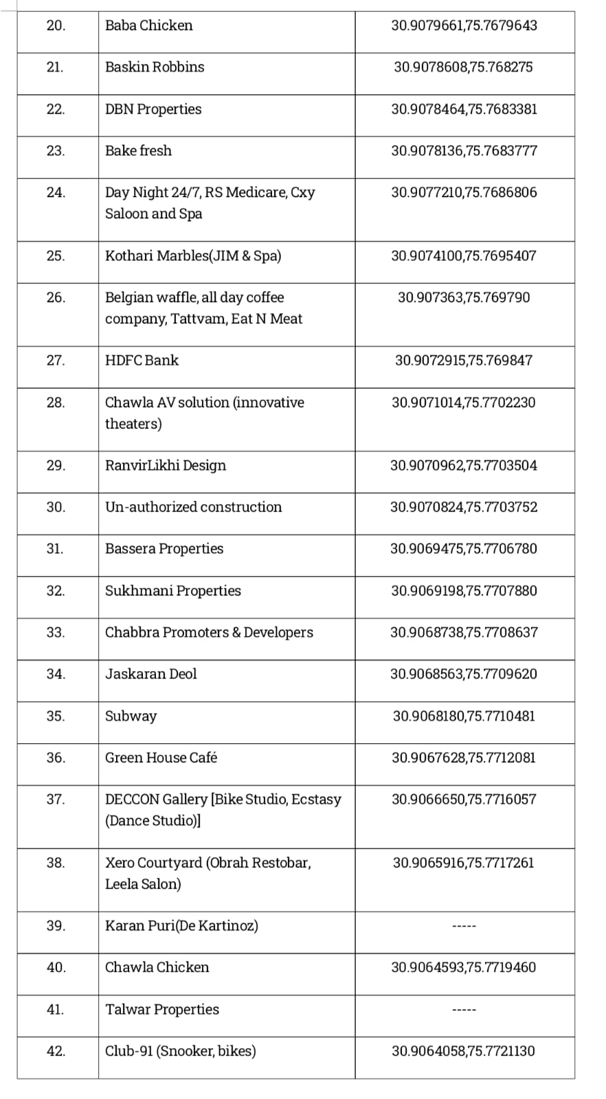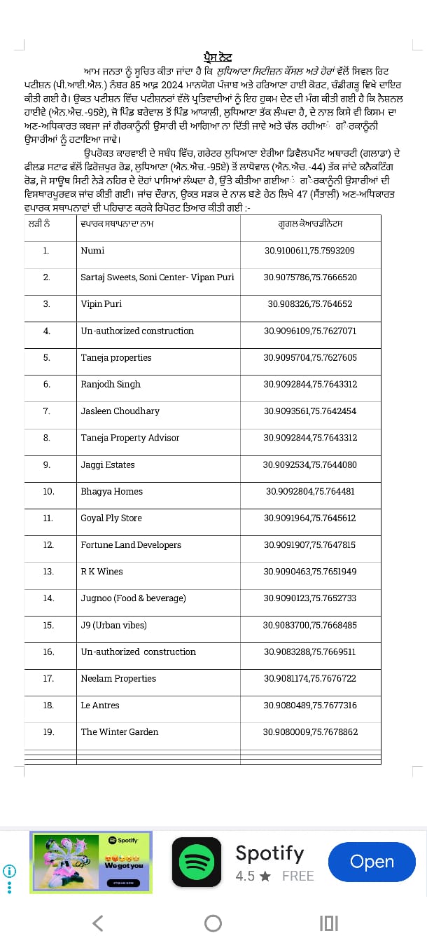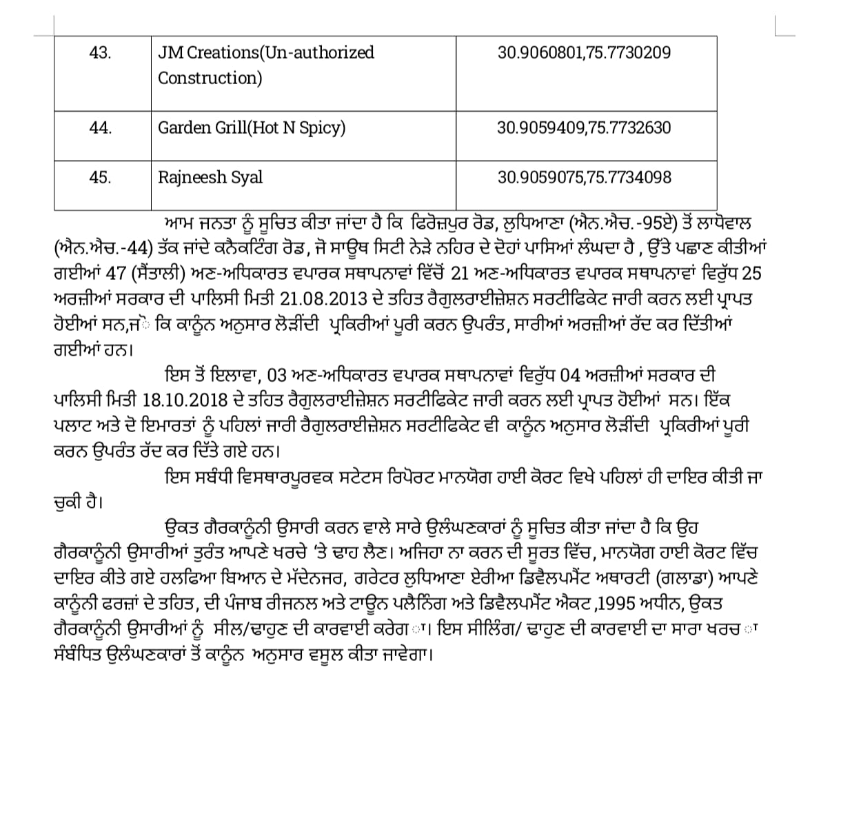 फिरोजपुर रोड से लाडोवाल सिधवान कैनाल (नेशनल हाईवे 95) के साथ साथ दोनों बनी 47 इलीगल बिल्डिंग को गिराने की कार्रवाई का नोटिस ग्लाडा की की ओर से जारी कर दिया गया है। फिलहाल डिपार्टमेंट ने बिल्डिंग मालिकों को खुद अपने-अपने इलीगल निर्माण तुरंत हटाने को कहा है और ऐसा न होने की सूरत पर यह कार्रवाई डिपार्टमेंट की ओर से की जाएगी। सिटिजन काउंसिल में अन्य की ओर से सिविल रिट पिटीशन 85 of 2024 माननीय पंजाब एंड हरियाणा हाई कोर्ट में दायर की गई थी। इस पिटीशन में पेटीशनर्स की ओर से यह मांग की गई है कि नेशनल हाईवे 95 ए जो कि सिंधवा कैनाल के साथ-साथ होकर निकलता है, पर किसी भी तरह की कमर्शियल निर्माण को मंजूरी न दी जाए और अगर यहां पर कोई निर्माण किया गया है तो उसे हटाया जाए, संबंधी हाई कोर्ट से मांग की गई है। जिसको लेकर ग्रेटर लुधियाना एरिया डेवलपमेंट अथॉरिटी की ओर से फिरोजपुर रोड लुधियाना से सिधवा नहर के साथ साथ लडोवाल तक (नेशनल हाईवे 95 ए) तक जाते और लाडोवाल तक (नेशनल हाईवे 44) जाते कुल 47 इलीगल कमर्शियल निर्माण ट्रेस किए गए थे। जिन में न्यूमी रेस्टोरेंट, बाबा चिकन, चावल चिकन सहित कई नामी बिल्डिंग मेंशामिल है। इनमें से कुछ बिल्डिंग मालिकों की ओर से पॉलिसी 2013 और पॉलिसी 2018 के तहत अपने निर्माण रेगुलर करवाने को ग्लाडा के पास आवेदन किए गए थे। लेकिन यह सभी आवेदन नियमों को पूरा न करने के चलते रद्द कर दिए गए हैं, हालांकि ग्लाडा की ओर से पहले कुछ आवेदनों को रेगुलराइज भी कर दिया गया था, लेकिन मामला हाईकोर्ट में विचाराधीन होने के चलते यह सभी आवेदन रद्द कर दी गए हैं। ग्लाडा की ओर से आप सभी बिल्डिंग मालिकों को तुरंत अपने इलीगल निर्माण गिरने संबंधी नोटिस जारी कर दिया गया है और ऐसा न होने की सूरत में ग्लाड़ा की और से इन बिल्डिंगों को गिराने की कार्रवाई शुरू की जाएगी जिसका खर्च बिल्डिंग मलिक को उठाना पड़ेगा। इन 47 बिल्डिंग का ब्यौरा नीचे दिया गया है।