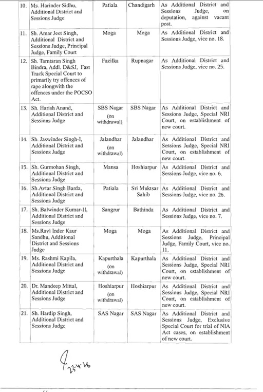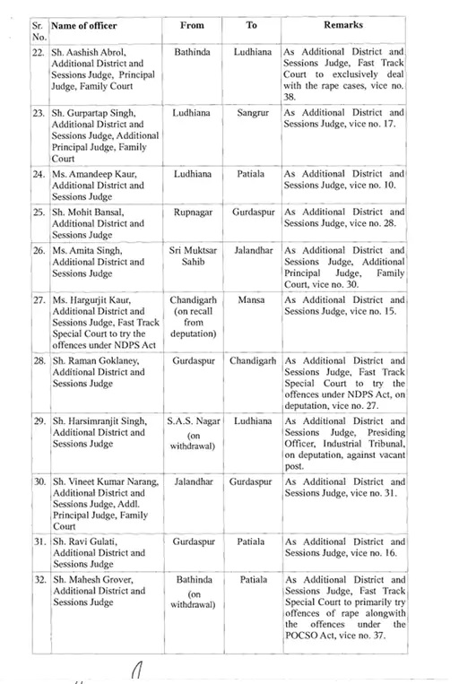पंजाब। पंजाब एवं हरियाणा हाई कोर्ट ने आज एक आदेश जारी कर 84 जजों का तबादला कर दिया है। इनमें 38 जज पंजाब के हैं, जबकि 46 जज हरियाणा के हैं। इसमें निर्भय सिंह गिल को जालंधर से फतेहगढ़ साहिब, जितेंद्र पाल सिंह को पठानकोट से एसबीएस नगर, अरुण गुप्ता को फतेहगढ़ साहिब से मलेरकोटला भेजा गया है। वहीं मोहाली के हरदीप सिंह, एडिशनल डिस्ट्रिक्ट एवं सेशन जज को एग्जीक्यूटिव स्पेशल कोर्ट में ट्रायल के लिए NIA केस भी सौंपे गए हैं। इस आधिकारिक आदेश के माध्यम से कई अतिरिक्त जिला एवं सत्र न्यायाधीशों (Additional District and Sessions Judges) के तबादले और नई नियुक्तियाँ की गई हैं। इस सूची के अनुसार, सुश्री हरिंदर सिद्धू को पटियाला से चंडीगढ़ स्थानांतरित किया गया है, जबकि श्री तरनतारन सिंह बिंद्रा को फाजिल्का से रूपनगर भेजा गया है। आदेश की एक मुख्य विशेषता नए न्यायालयों की स्थापना है, जिसके तहत श्री हरीश आनंद, श्री जसविंदर सिंह-I, सुश्री रश्मि कपिला और डॉ. मनदीप मित्तल को उनके संबंधित जिलों में नवनिर्मित स्पेशल एनआरआई कोर्ट (Special NRI Court) में तैनात किया गया है। इसके अतिरिक्त, श्री हरदीप सिंह को एस.ए.एस. नगर (मोहाली) में एनआईए एक्ट (NIA Act) के मामलों की सुनवाई के लिए विशेष अदालत का प्रभार दिया गया है। अधिकांश नियुक्तियाँ प्रशासनिक आवश्यकताओं और रिक्त पदों को भरने के उद्देश्य से की गई हैं।