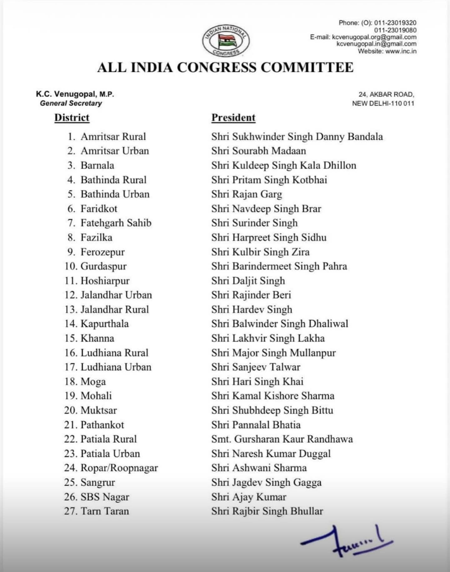 पंजाब कांग्रेस की ओर से मंगलवार देर रात जिला प्रधानों की सूची जारी कर दी है। जिसमें कांग्रेस के जिला प्रधान संजय तलवार फिर से प्रधान घोषित कर दिए गए हैं। जारी की गई नई प्रधानों की सूची से हिसाब हो गया है कि इस नए चुने गए और पुराने रिपीट किए गए प्रधानों के चयन में कांग्रेस के दिग्गज नेता प्रताप सिंह बाजवा और कांग्रेस के प्रदेश प्रधान अमरिंदर सिंह राजा वडिंग का दबदबा रहा है।